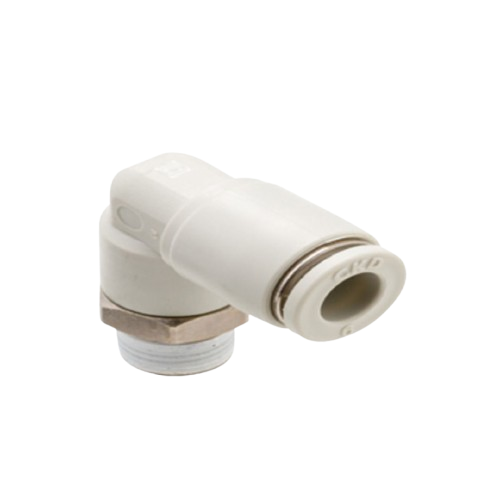 Conexión rápida CKD GWL6-8: acople tipo codo 90° push-in para tubo Ø 6 mm y rosca Rc ¼″. Compacto, ignífugo y de rápida instalación sin necesidad de herramientas.