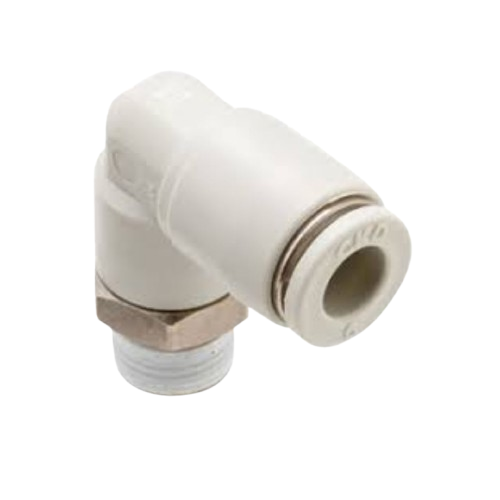 Conexión rápida CKD GWL10-10: acople en codo de 90° con rosca Rc 3/8″ y conexión push-in para tubo Ø 10 mm. Compacto, seguro y fácil de instalar.